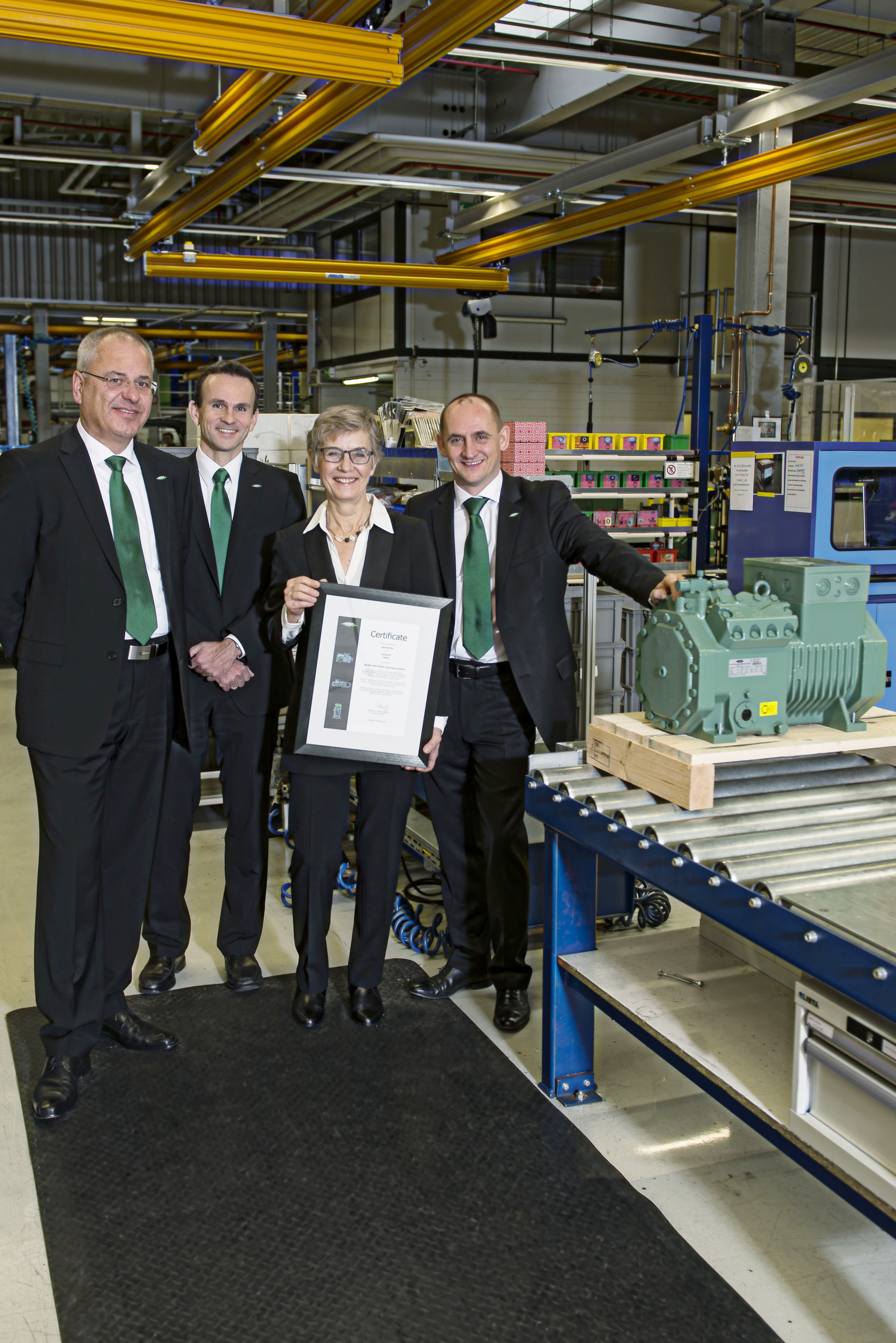 The 100,000th ECOLINE reciprocating compressor was presented to our Polish trading partner Berling S.A. This was celebrated by (from left to right) Frank Fuhlbrück (plant manager of BITZER Schkeuditz), Volker Stamer (director of stationary products at BITZER), Hanna Berling (CEO of Berling S.A.) and Michael Eichberger (managing director of BITZER Austria).